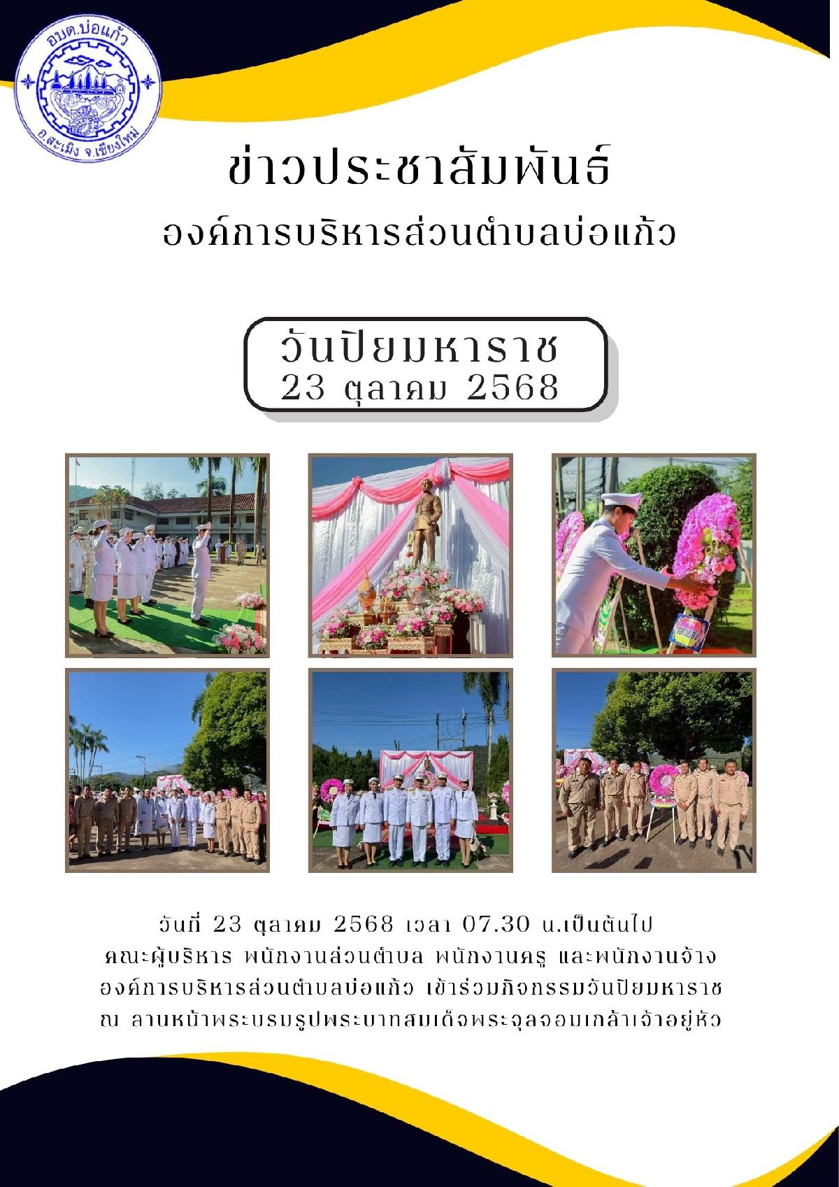 วัน พุธ ที่ 23 ตุลาคม 2568 เวลา 7.00 น. นายเศรษฐศิลป์ แสงสกาวรัตน์ นายกองค์การบริหารส่วนตำบลบ่อแก้ว มอบหมายให้นายณัฐ ปาณะจำนงค์ หัวหน้าสำนักปลัด พร้อมด้วยสมาชิกสภา พนักงานส่วนตำบล พนักงานครู และพนักงานจ้าง เข้าร่วมกิจกรรมวันปิยมหาราช (วันสวรรคตพระบาทสมเด็จพระจุลจอมเกล้าเจ้าอยู่หัว) ณ ลานหน้าพระบรมรูปพระบาทสมเด็จพระจุลจอมเกล้าเจ้าอยู่หัว ที่ว่าการอำเภอสะเมิง เพื่อเป็นการน้อมรำลึกในพระมหากรุณาธิคุณของพระบาทสมเด็จพระจุลจอมเกล้าเจ้าอยู่หัว