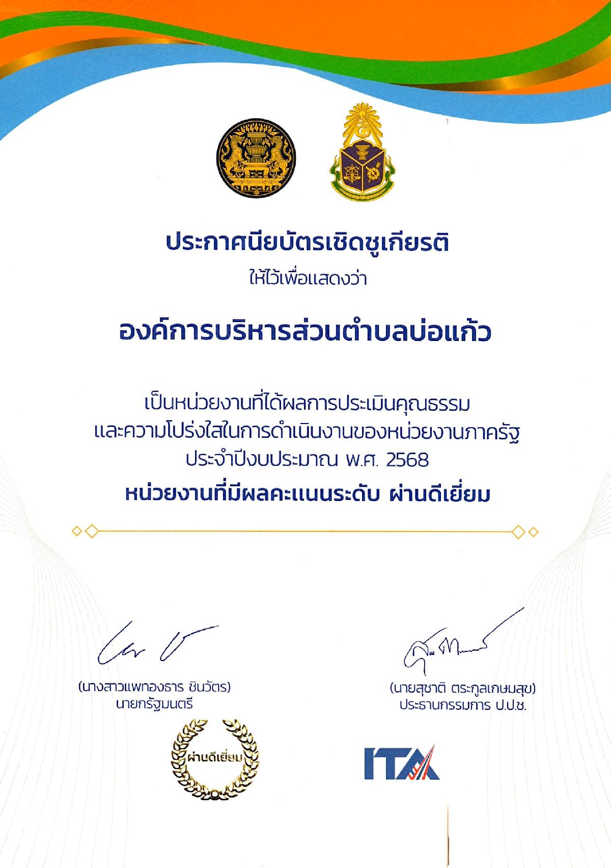 นายเศรษฐศิลป์ แสงสกาวรัตน์ นายกองค์การบริหารส่วนตำบลบ่อแก้ว มอบหมายให้ นายนะที เมอชิ เลขานุการนายกองค์การบริหารส่วนตำบลบ่อแก้ว เข้ารับรางวัลประกาศนียบัตรเชิดชูเกียรติ ผลการประเมินคุณธรรมและความโปร่งใสในการดำเนินงานของหน่วยงานภาครัฐ ประจำปีงบประมาณ พ.ศ. 2568 หน่วยงานที่มีผลคะแนนระดับ ผ่านดีเยี่ยม