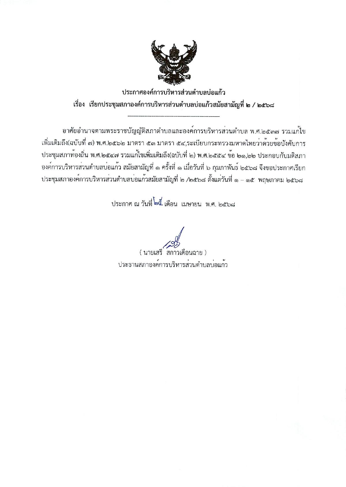 ประกาศ เรียกประชุมสภาองค์การบริหารส่วนตำบลบ่อแก้ว สมัยสามัญที่ 2 / 2568