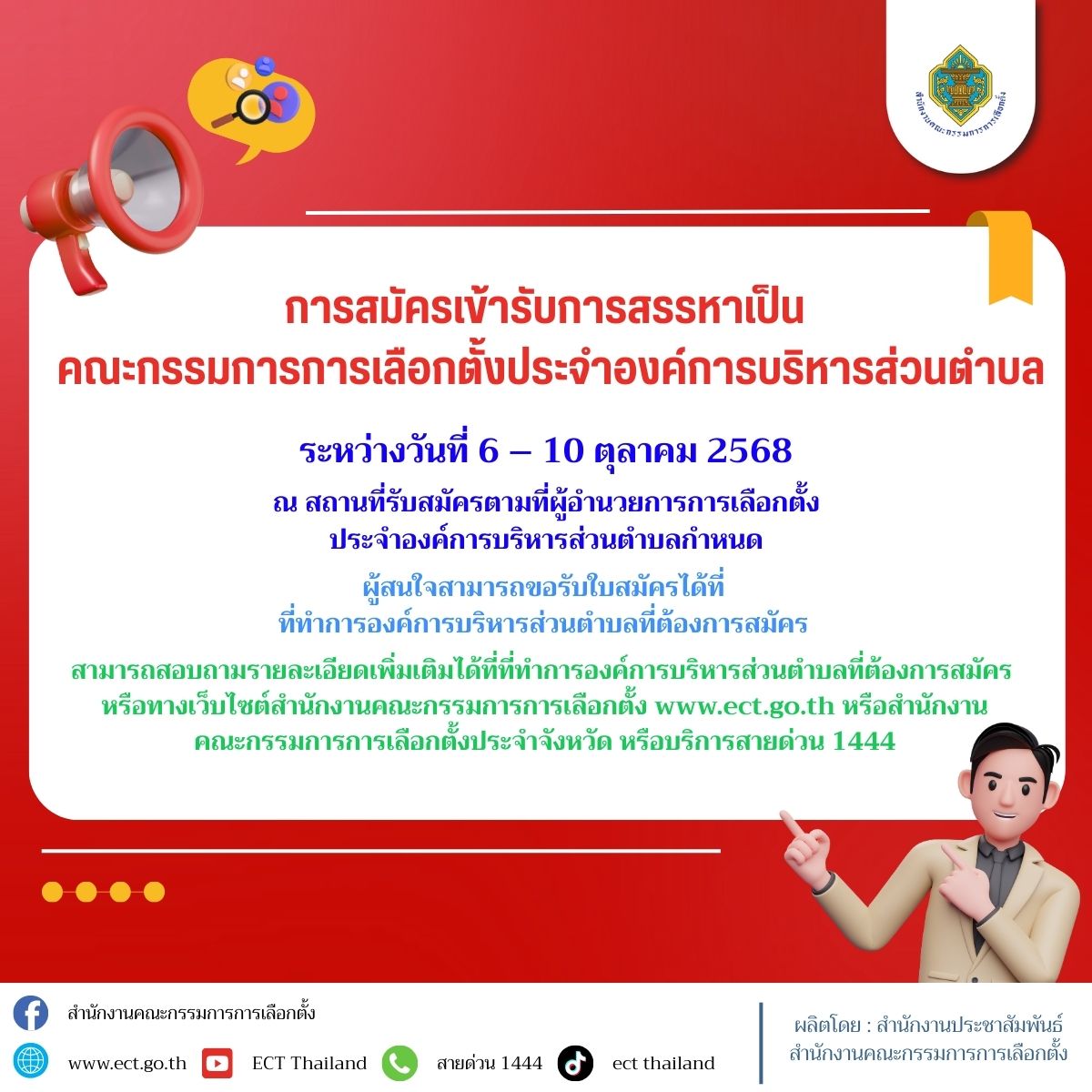 2. วัน เวลา และสถานที่รับสมัครรับสมัครระหว่างวันที่ 6 – 10 ตุลาคม 2568 เวลา 08.30 – 16.30 น. ณ สถานที่รับสมัครตามที่ผู้อำนวยการการเลือกตั้งประจำองค์การบริหารส่วนตำบลกำหนด