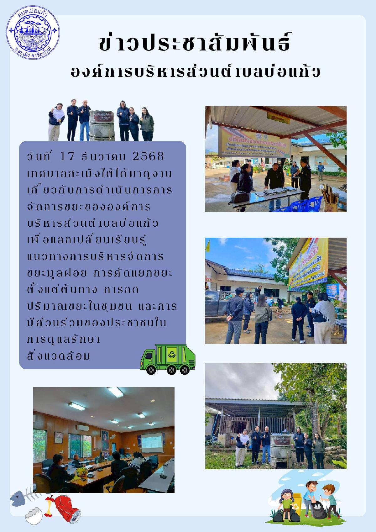 เทศบาลสะเมิงใต้ ได้เข้าศึกษาดูงานเกี่ยวกับการดำเนินการการจัดการขยะขององค์การบริหารส่วนตำบลบ่อแก้ว เพื่อแลกเปลี่ยนเรียนรู้แนวทางการบริหารจัดการขยะมูลฝอย การคัดแยกขยะตั้งแต่ต้นทาง การลดปริมาณขยะในชุมชน และการมีส่วนร่วมของประชาชนในการดูแลรักษาสิ่งแวดล้อม